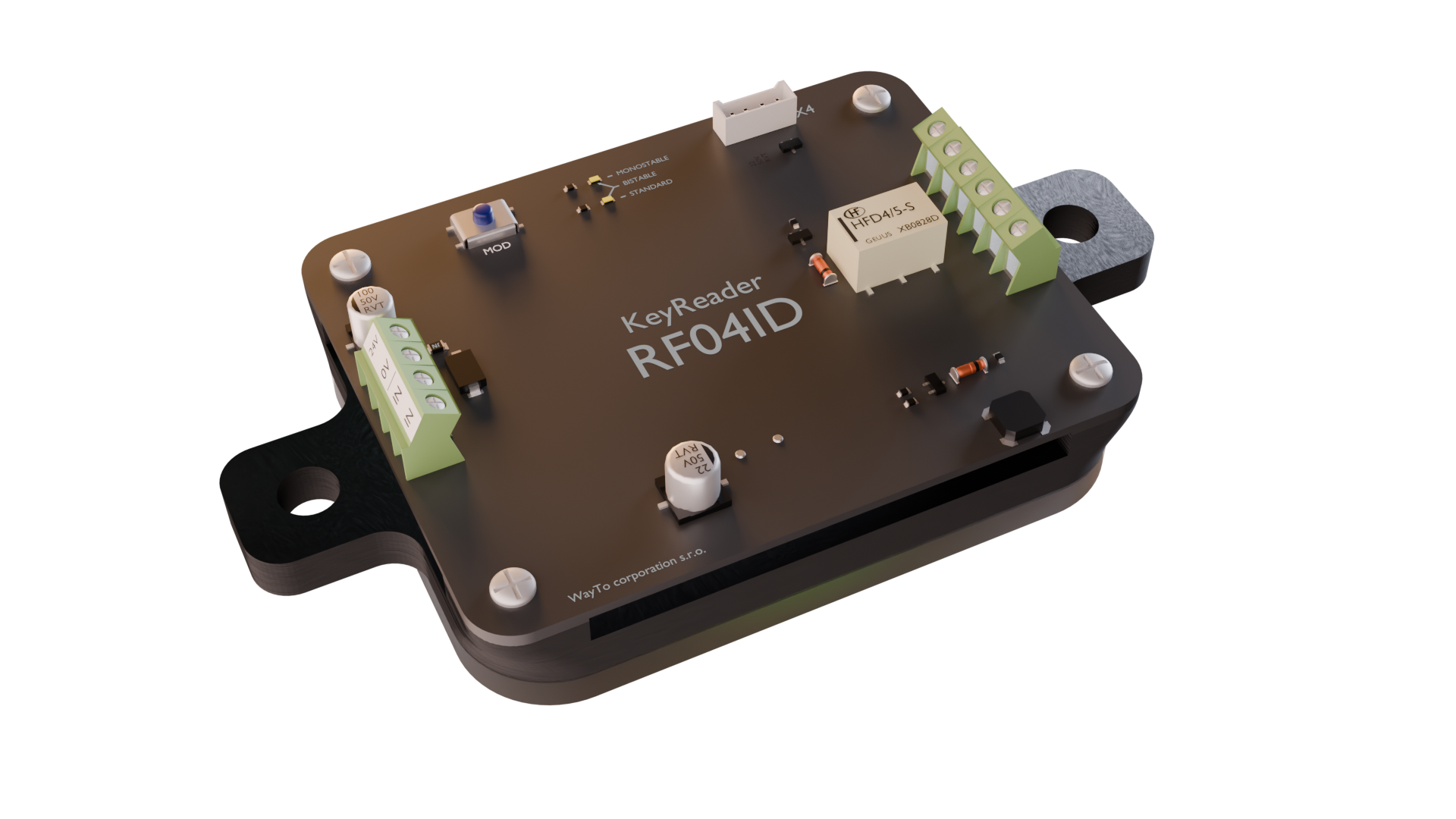 KeyReader RF04ID je čtecí zařízení umožňující řídit elektrické relé pomocí RFID klíčů, tagů, karet apod. Slouží k ovládání přístupových systémů, elektromagnetických zámků, přístupu do výtahu apod.